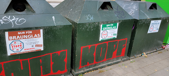 Recycling – Germans take their recycling very seriously. We were used to single stream recycling in the last three places we lived (Phoenix, Houston, and Baltimore), but here, most of it is sorted into separate streams for paper, glass, and plastic, along with composting. Even the glass is separated by color – white, green and brown. These large collection bins are scattered around the neighborhood.